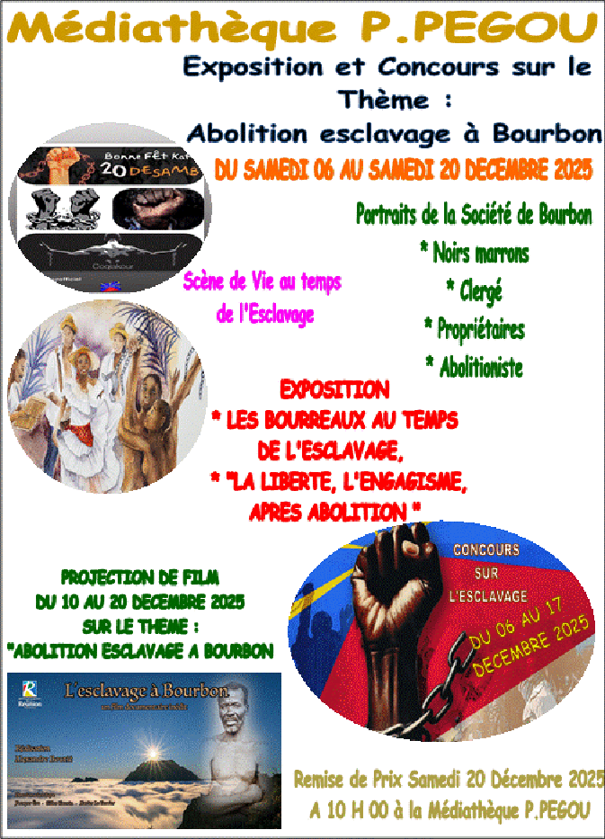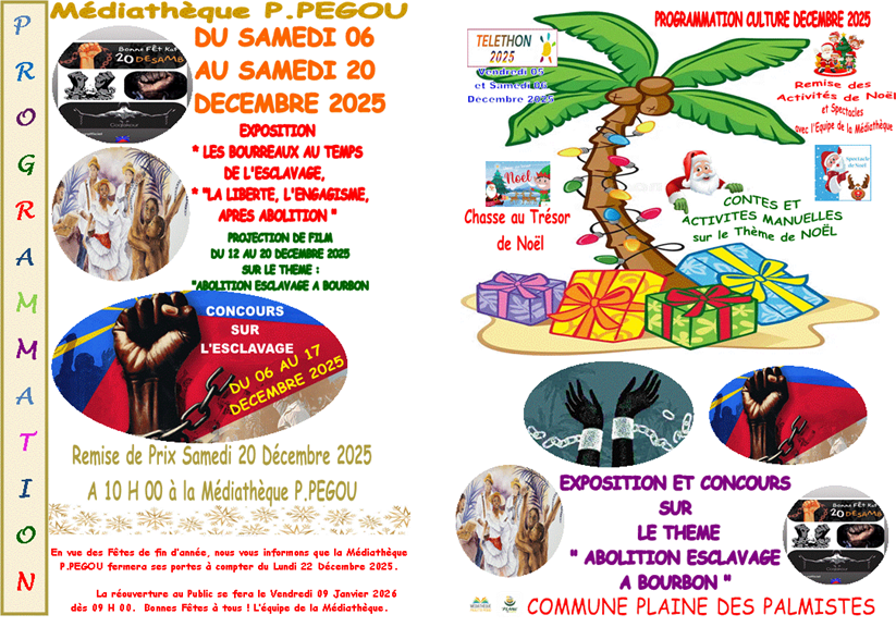 Le programme culturel de la médiathèque Paulette Pégou pour le mois de décembre 2025. Ce mois-ci, certains événements sont consacrés tout particulièrement à l’abolition de l’esclavage. Le détail ci-dessous :