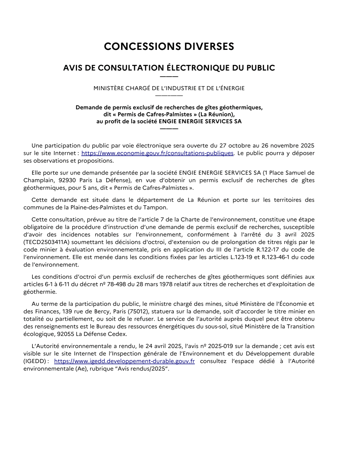 Le Ministère de l’industrie et de l’énergie lance une consultation. Elle sera ouverte du 27 octobre 2025 au 26 novembre 2025 à l’adresse suivante : www.economie.gouv.fr/consultations-publiques