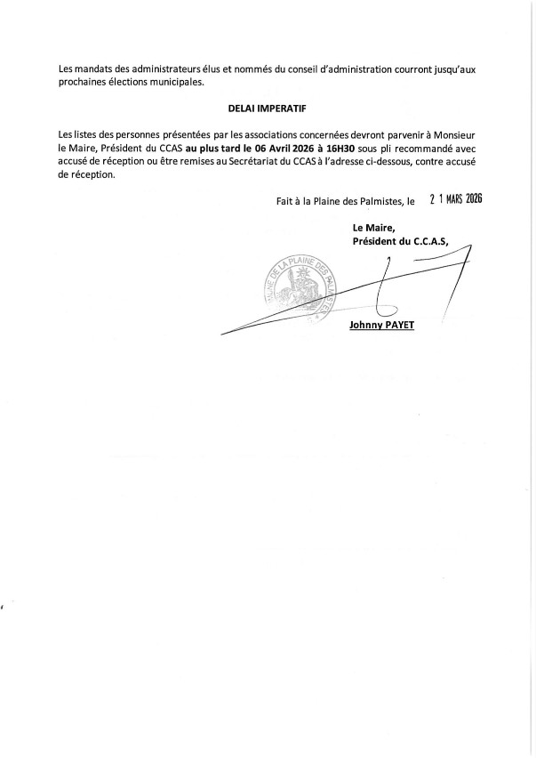 Suite aux élections municipales, le CCAS de La Plaine des Palmistes va procéder au renouvellement de son Conseil d’administration. De ce fait, les associations sont les bienvenues pour candidater et proposer les personnes susceptibles de les représenter au sein de celui-ci.