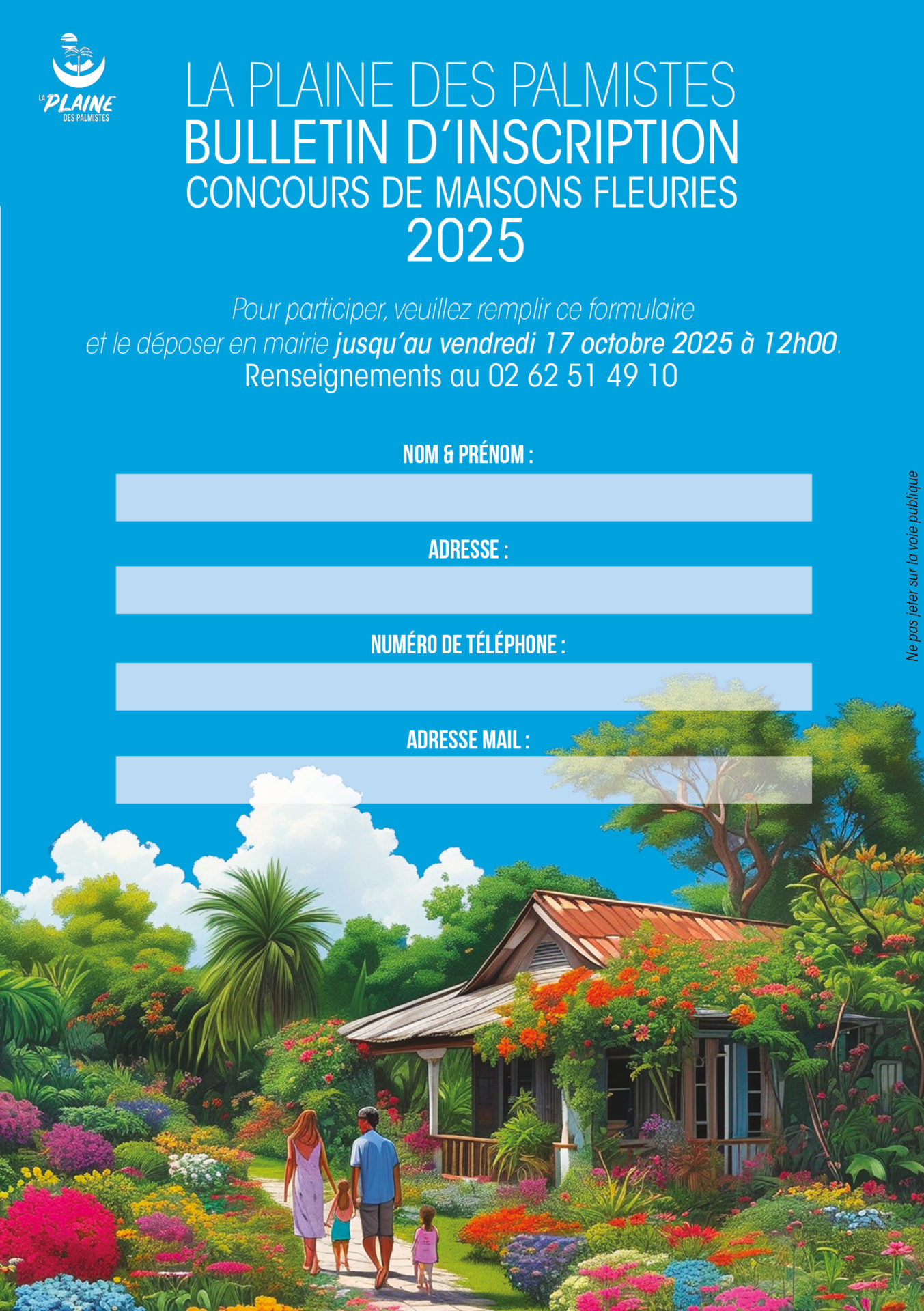 👉 Concernant le Concours de Maisons Fleuries, vous pouvez vous y inscrire dès à présent en imprimant bulletin d’inscription ci-dessous, ou en le récupérant en mairie ou au Service des Sports (impasse des Écoles), en le remplissant de manière lisible et en le déposant à l’accueil de l’Hôtel de Ville. Fin des inscriptions le vendredi 17 octobre à midi.