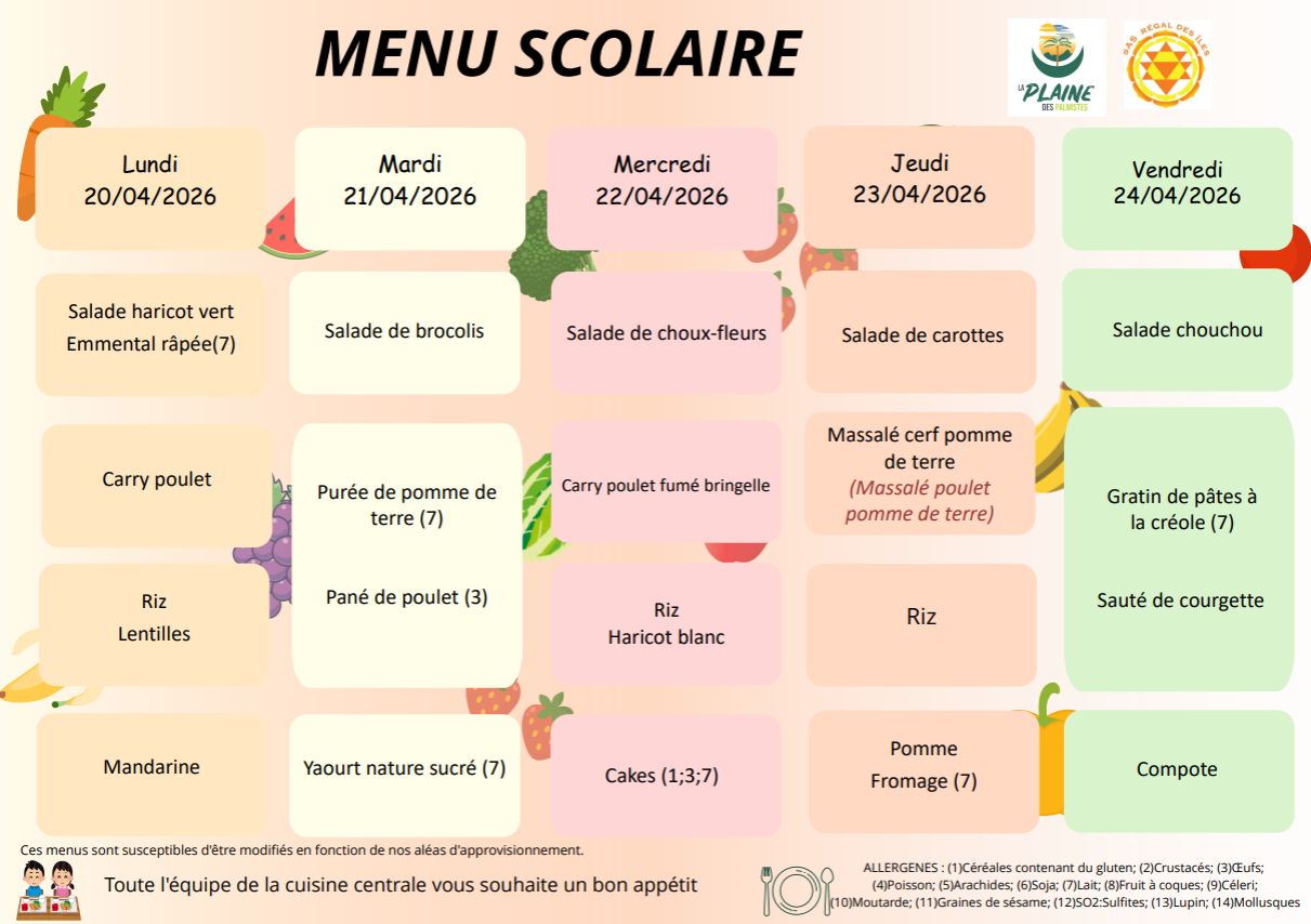 Pour toute information relative à la restauration scolaire, veuillez vous rapprocher de la régie restauration scolaire située à la Mairie au 0262 51 49 10.
